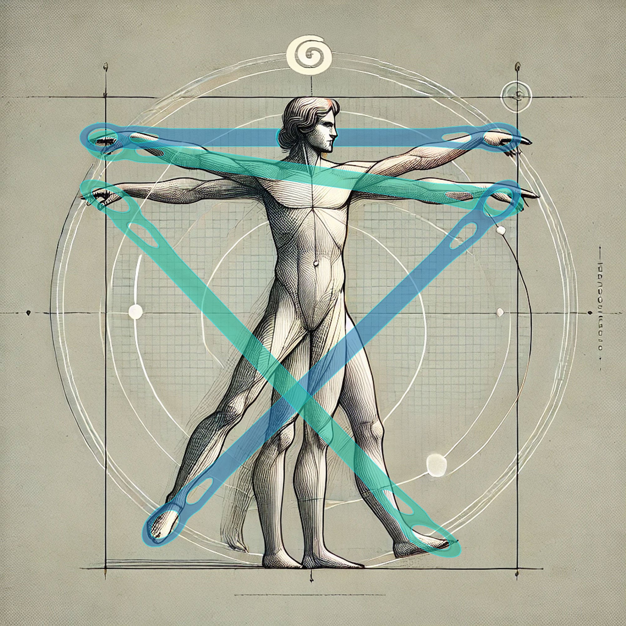 Flow bands, being loosely inspired by "Vitruvian Man" represent tools designed to explore the full range of human movement.